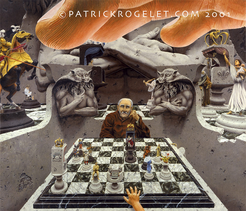 Rien n'est choisi au hasard, chaque détail a une signification et donne lieu a de multiples commentaires en fonction de la personne qui regarde le dessin. S'il s'agit en l'occurrence d'un joueur d'échecs assidu, comme ce fut le cas de Patrick, il va tout de suite saisir les symboliques, être attentif au positionnement stratégique des pièces sur les deux plateaux et comprendre que le joueur qui nous fait face est, quoi qu'il arrive, perdu. Toutes ces structures gigognes correspondent à différents points de vue, des visions aléatoires aux perspectives déstabilisantes.