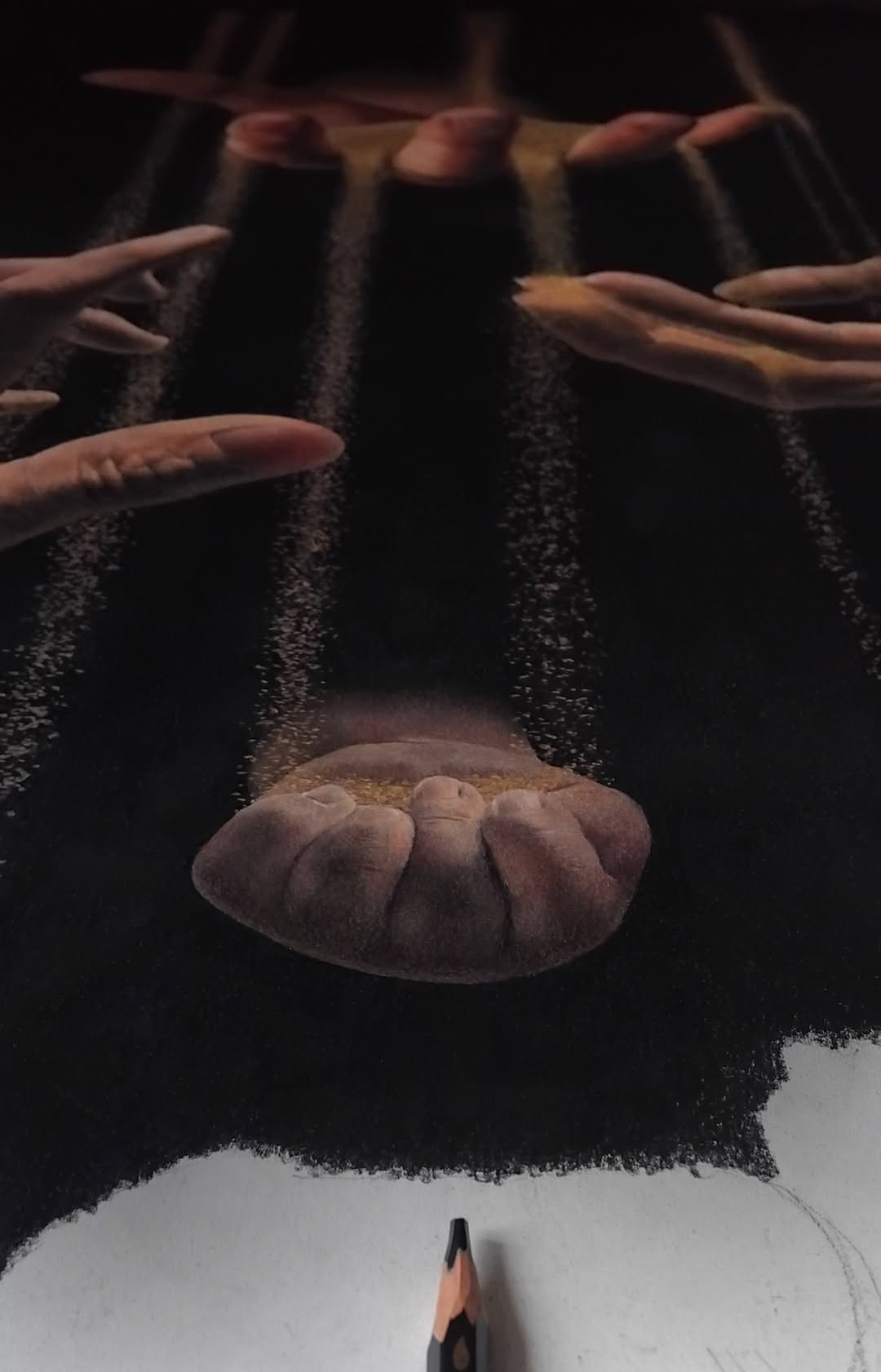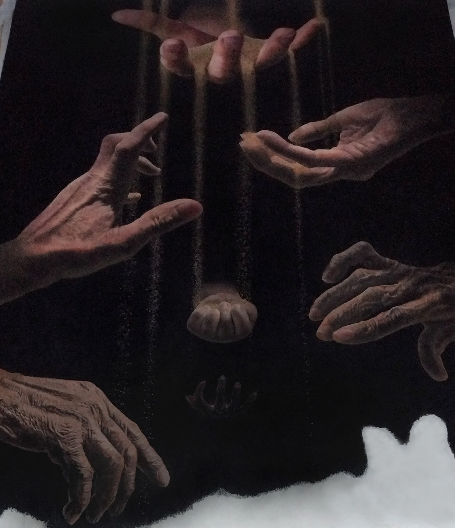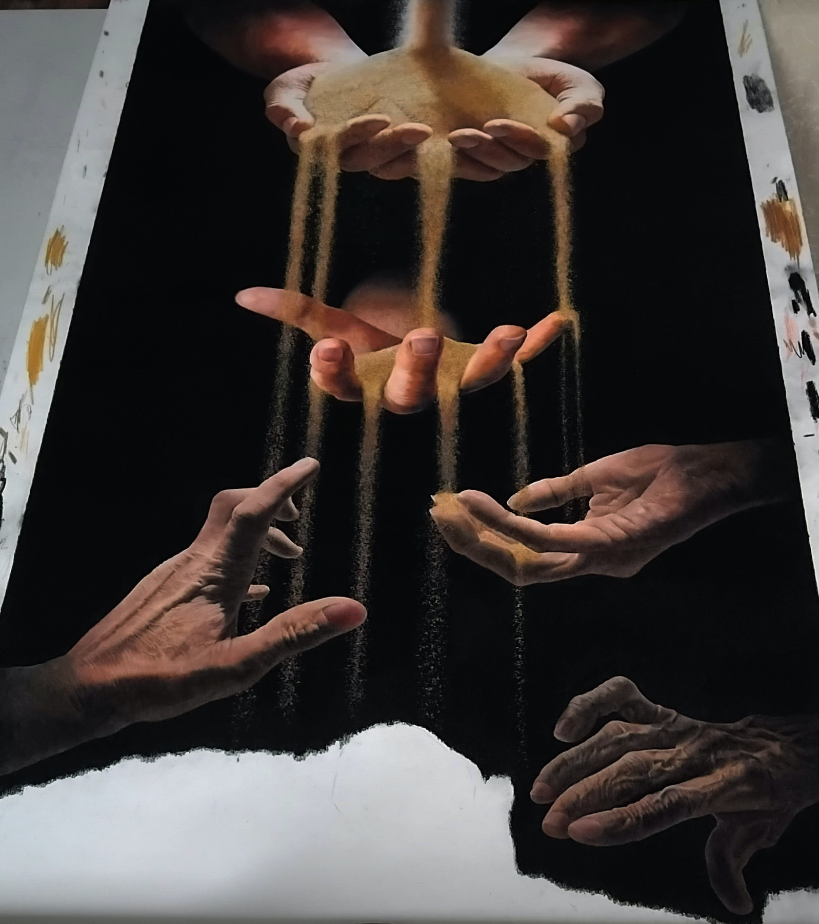 L'égalité, si souvent promise, est une illusion niée par les structures mêmes de nos sociétés. À travers une composition verticale cette allégorie commence avec un filet de sable doré qui s’écoule d’une source unique, capté d’abord par des mains charnues, symboles d’un privilège insolent. Ces mains, placées à hauteur des yeux du spectateur, retiennent l’abondance, ne laissant s’échapper que de minces filets à travers leurs doigts. Plus bas, des mains frêles, torturées, implorantes ou désespérées luttent pour saisir ces miettes, tandis que le sable, perdant son éclat doré, se mue en un gris stérile. Au sol, dans une abondance paradoxale, des mains mourantes émergent, dans une lumière devenue quasi inexistante, comme un cri étouffé de ceux que l’inégalité a réduits à l’état de vestiges. Négalité confronte le spectateur à une réalité inconfortable. Le fond noir, incarnation du néant, et le faisceau lumineux venant du haut accentuent la verticalité hiérarchique, tandis que la gradation du sable – du doré éclatant au gris mortuaire – traduit la déchéance des espoirs. Pour voir les détails tragiques du bas, le spectateur devra se pencher, s’accroupir, s’abaisser : un geste physique qui devient une métaphore de l’effort nécessaire pour reconnaitre les invisibles, ceux que la "négalité" a ensevelis.