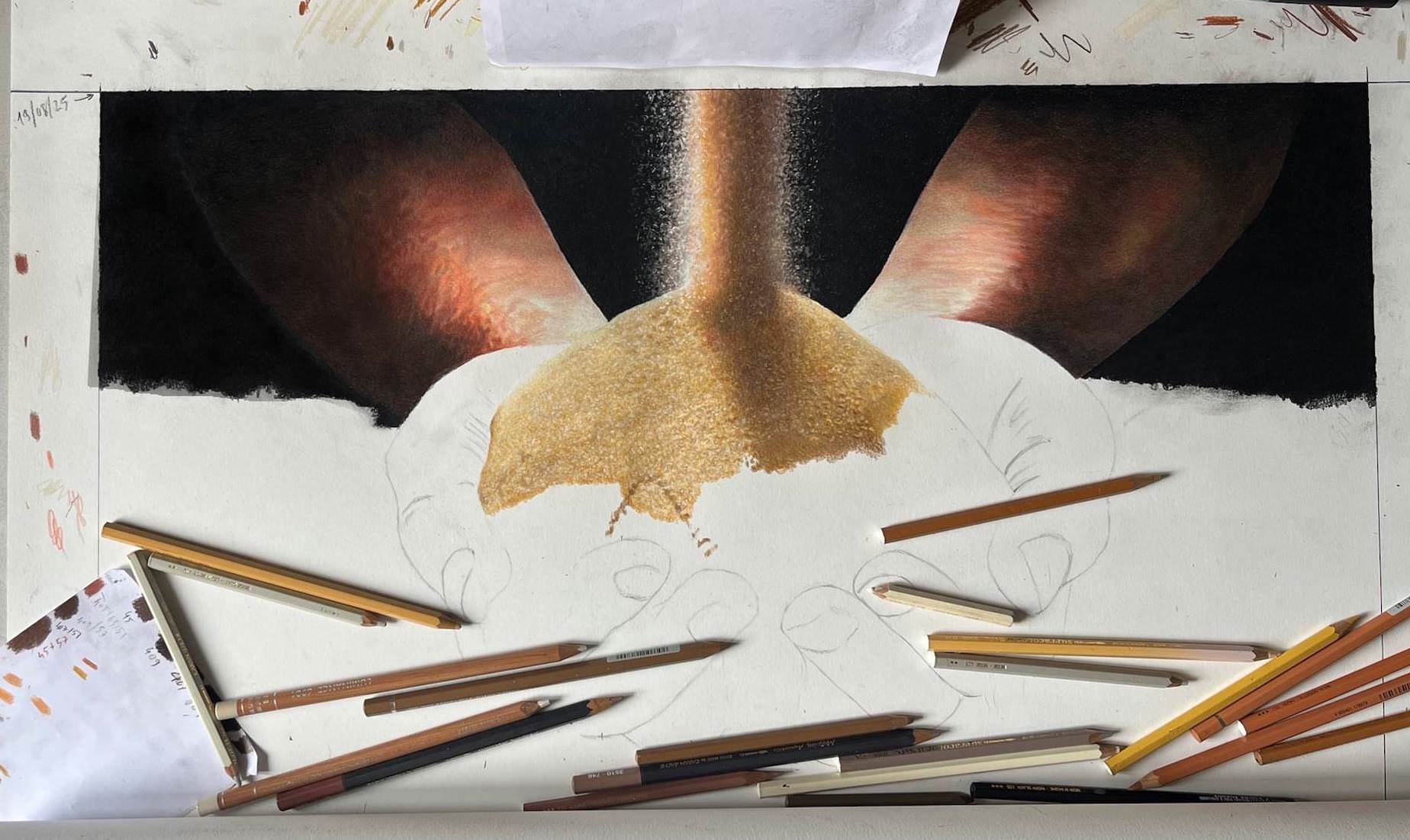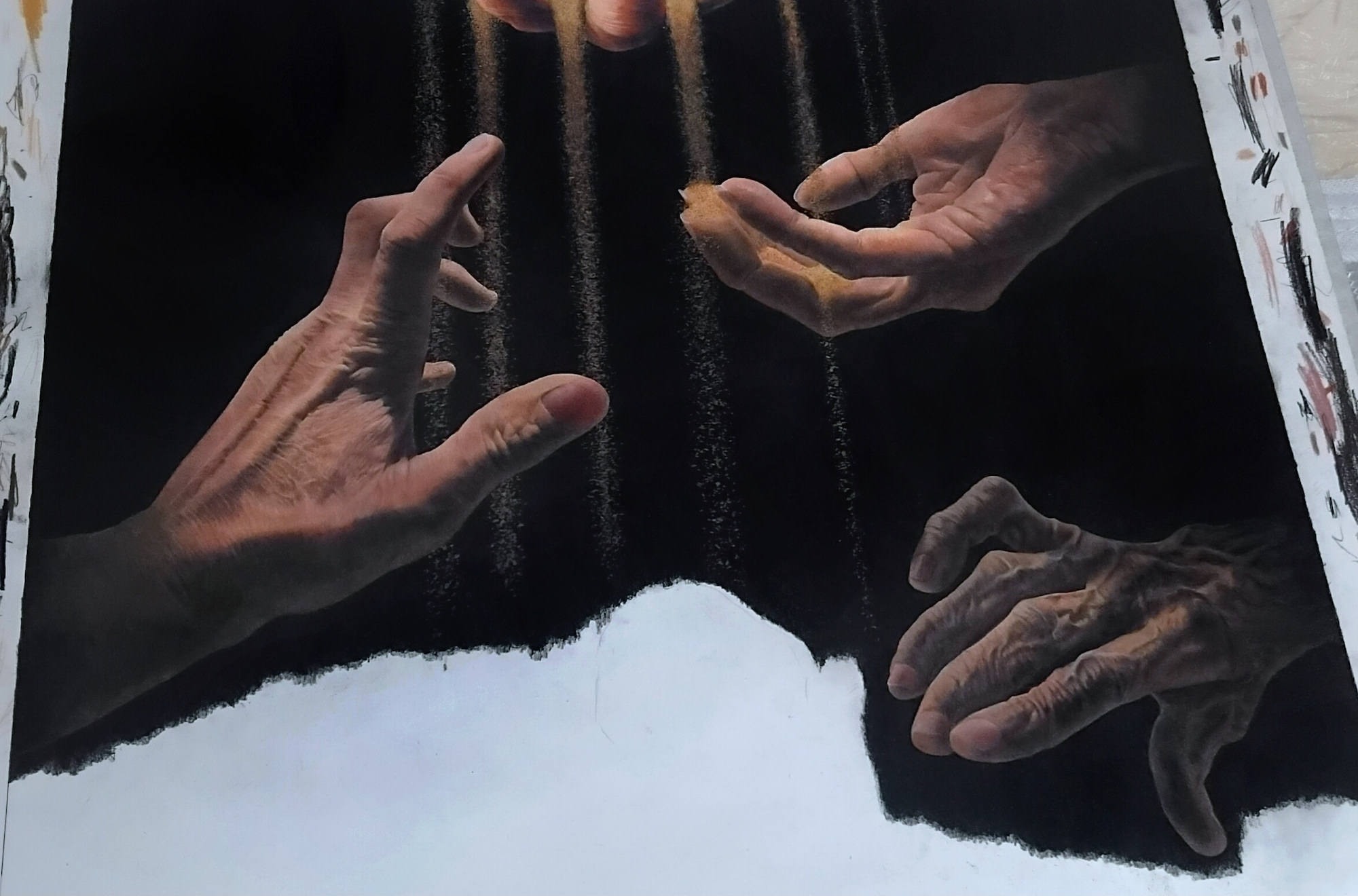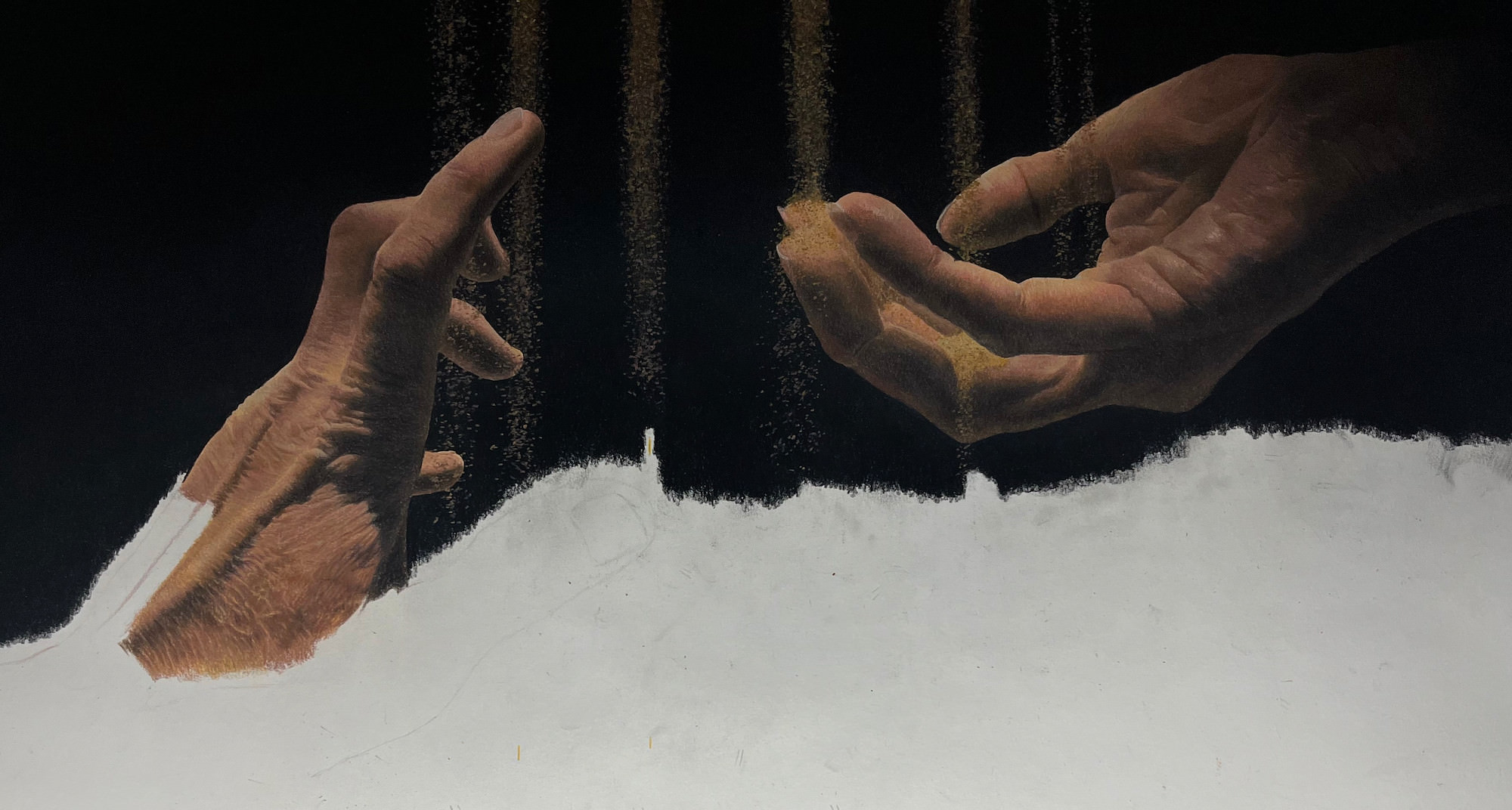 L'égalité, si souvent promise, est une illusion niée par les structures mêmes de nos sociétés. À travers une composition verticale cette allégorie commence avec un filet de sable doré qui s’écoule d’une source unique, capté d’abord par des mains charnues, symboles d’un privilège insolent. Ces mains, placées à hauteur des yeux du spectateur, retiennent l’abondance, ne laissant s’échapper que de minces filets à travers leurs doigts. Plus bas, des mains frêles, torturées, implorantes ou désespérées luttent pour saisir ces miettes, tandis que le sable, perdant son éclat doré, se mue en un gris stérile. Au sol, dans une abondance paradoxale, des mains mourantes émergent, dans une lumière devenue quasi inexistante, comme un cri étouffé de ceux que l’inégalité a réduits à l’état de vestiges. Négalité confronte le spectateur à une réalité inconfortable. Le fond noir, incarnation du néant, et le faisceau lumineux venant du haut accentuent la verticalité hiérarchique, tandis que la gradation du sable – du doré éclatant au gris mortuaire – traduit la déchéance des espoirs. Pour voir les détails tragiques du bas, le spectateur devra se pencher, s’accroupir, s’abaisser : un geste physique qui devient une métaphore de l’effort nécessaire pour reconnaitre les invisibles, ceux que la "négalité" a ensevelis.