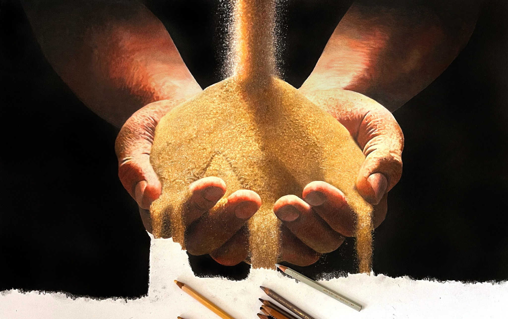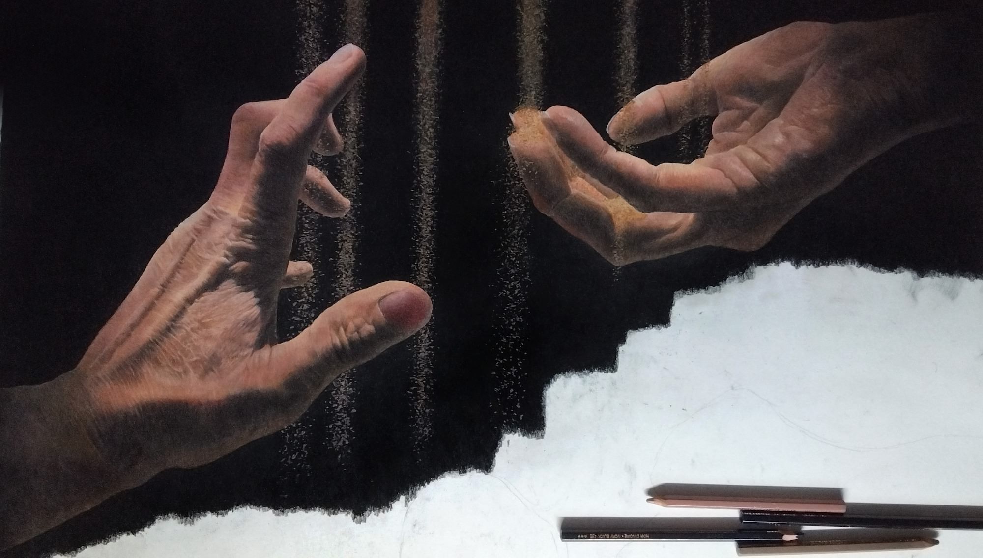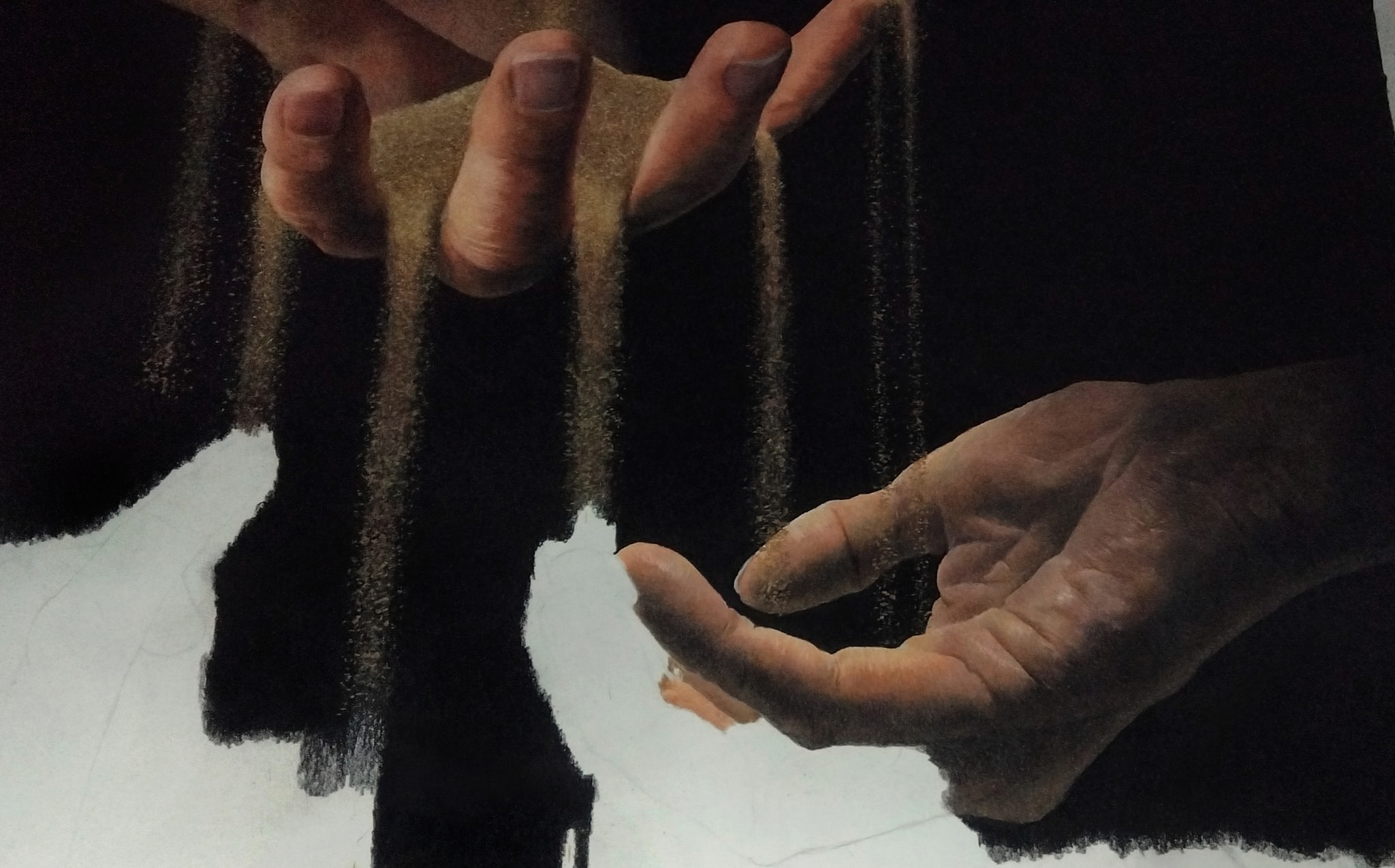 6. À partir d'ici les mains vont changer d'attitude, la lumière s'estomper, la saturation des couleurs diminuer, le sable perdre sa dorure. Nous descendons progressivement dans les profondeurs de Négalité. Contrairement à la précédente cette main n'est plus insolente d'ambition à capter un maximum de sable en écartant ses doigts le plus possible. Elle est timide, plus frêle, dans une attitude de mendicité. Elle se contente du peu qu'elle obtient.