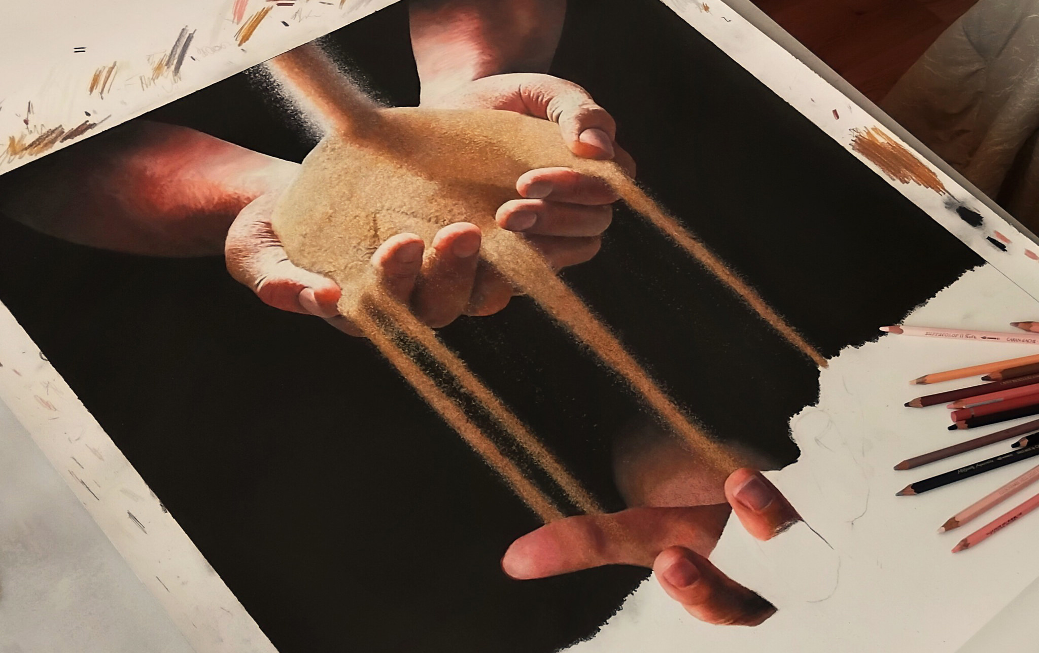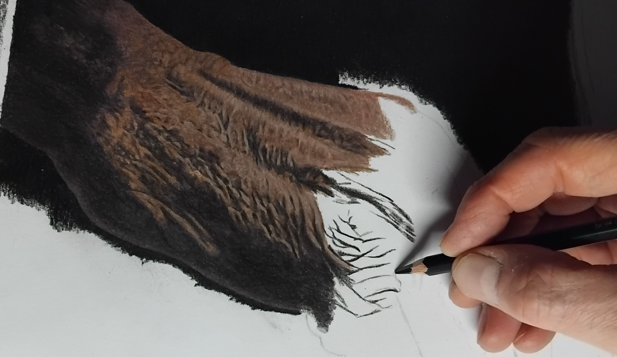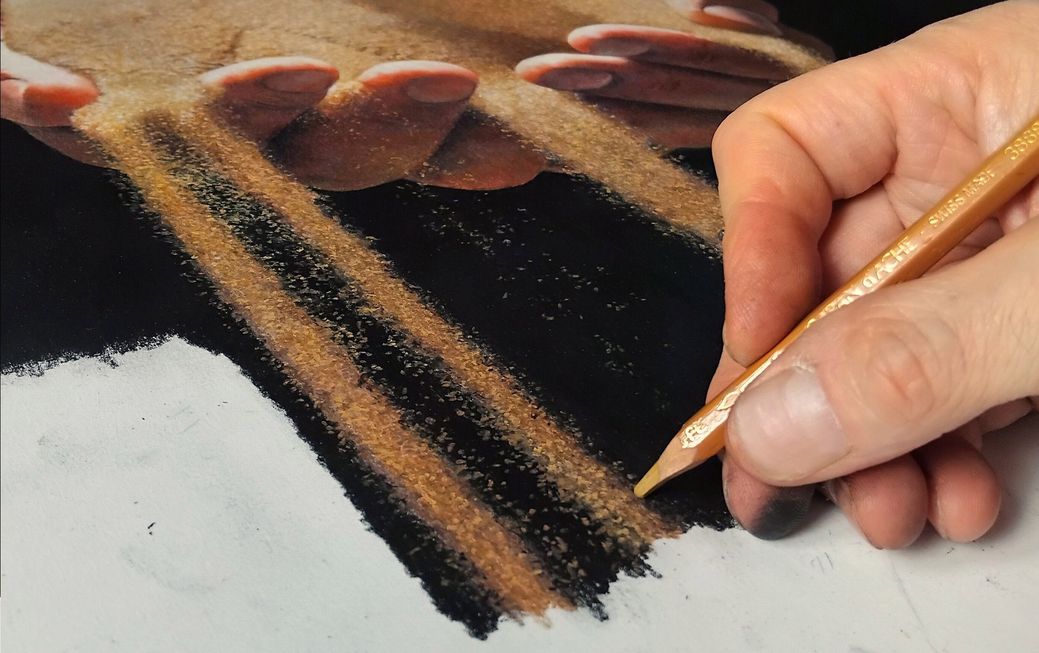 4. Passage délicat pour réaliser les nuances subtiles entre les teintes rosées et ocres. Le crayon n'autorise pas de repentir comme en peinture.