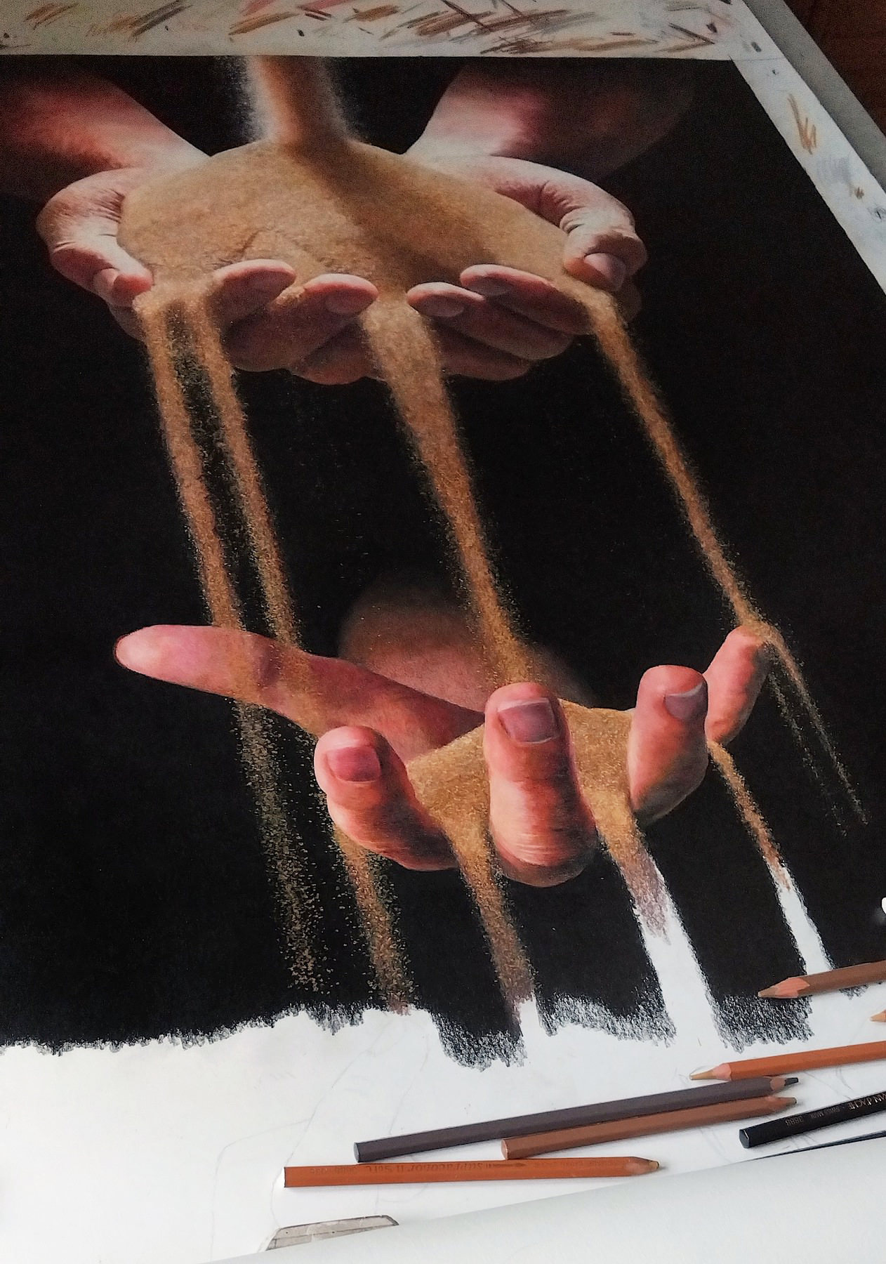 17. Voilà donc cette partie terminée où l'inégalité est aussi représentée sur les générations émergentes mais aussi interraciales. La main de cet enfant noir, déjà sombre et étant placée dans l'ombre de celle du dessus accentue cette inégalité dans la représentation elle-même, car ne recevant pas de sable elle ne reçoit pas non plus la lumière et n'est donc pas visible de prime abord. Il faut aller la chercher si on ne veut pas passer à côté. Comme dans la vraie vie... Je n'avais pas la place de représenter toutes les races subissant les inégalités, cette main symbolise aussi l'inégalité raciale.