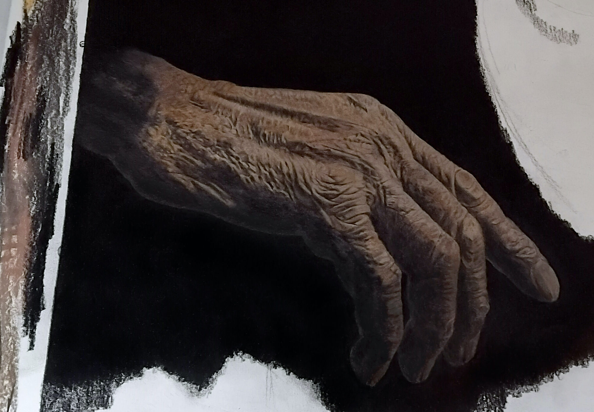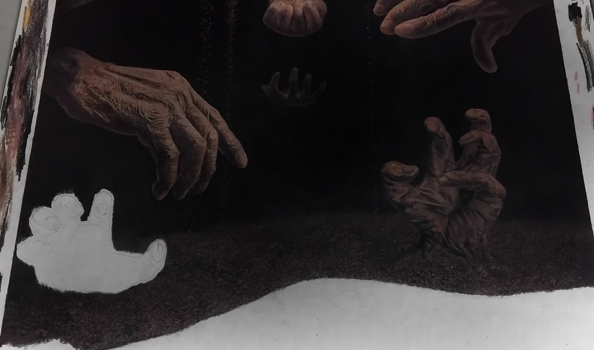 13. Un cycle s'achève avec ces 4 mains. La dernière en bas à gauche est le pendant en miroir de celle du dessus qui était dans l'espoir en pointant du doigt vers le haut. Elle plonge vers les profondeurs en pointant du doigt vers le bas, semblant perdre son énergie et abandonnant tout espoir. On peut les prendre deux à deux et imaginer que les deux du bas sont la projection dans le temps des deux du haut. La vieillesse accentue les inégalités dont la première qui concerne tout le monde : la santé. (Ce qui va se passer au milieu est à moitié finalisé. Je ne suis pas satisfait du résultat sur la deuxième partie à l'intérieur de ce cycle et y travaille encore...)