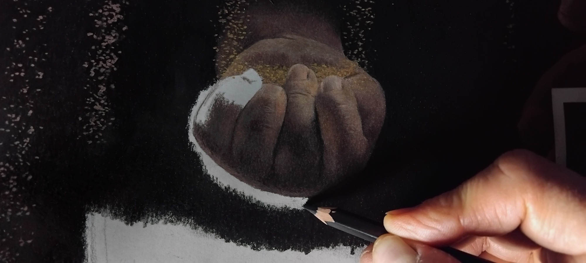 16. Seconde étape : je ne pouvais pas ne pas représenter la plus cruelle des inégalités, la famine qui touche essentiellement les enfants (jusqu'aux bébés) en Afrique. Pour cela je me suis inspiré de la célèbre et impressionnante photo de Mike Wells, prise en 1980, d'un missionnaire réconfortant un garçon ougandais pendant la famine, et qui a reçu le prix World Press Photo de l'année 1981. J'ai repris les traits et la forme de ses doigts pour la positionner ouverte.