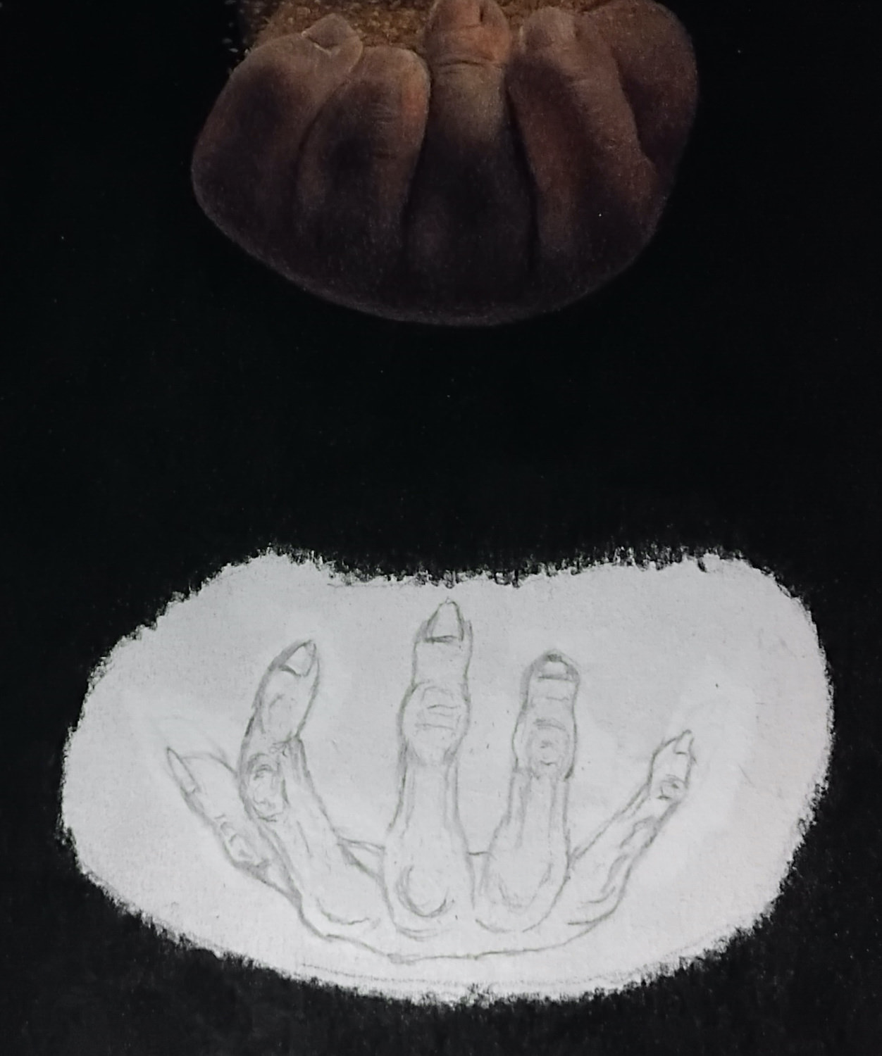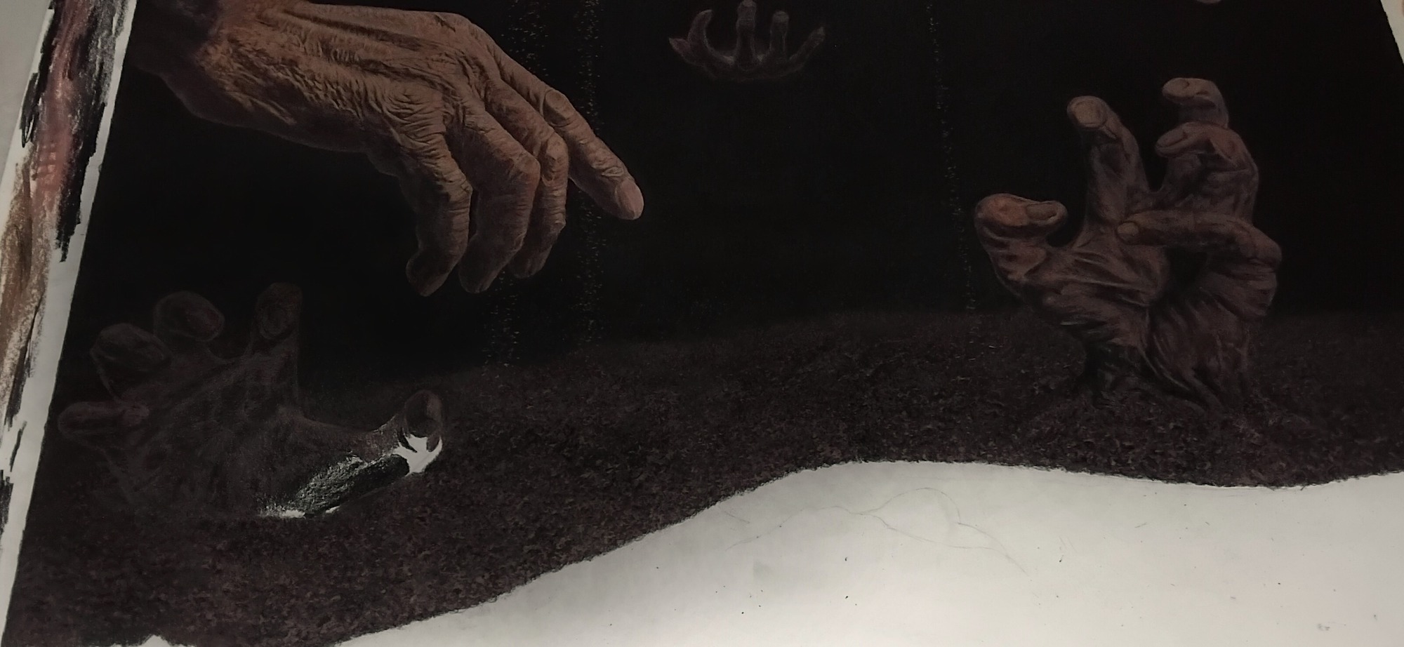 19. Nous voilà rendu au niveau le plus sombre de Négalité. Là où tout espoir est perdu. Le sable, symbole de l’abondance convoitée, est là en abondance, mais il ne sert à rien pour ceux qui sont ensevelis dessous. Il a perdu sa couleur (la photo n'est pas très représentative des nuances subtiles dans le sombre). Cette main n'est pas inconnue. Elle s'appelle "Main désespérée". C'est une sculpture d'Antoine Bourdelle (vers 1900). Je l'ai transformée légèrement en apportant un peu plus de détails sur les phalanges pour qu'elle soit plus réaliste. Elle prend tout son sens ici. La référence à l'Art montre que les artistes ont toujours dénoncé les travers de la société, dont les inégalités. Cela montre aussi son aspect intemporel. Mon œuvre est un manifeste sur l'inégalité, y inclure une œuvre artistique comme illustration permet de boucler la boucle...