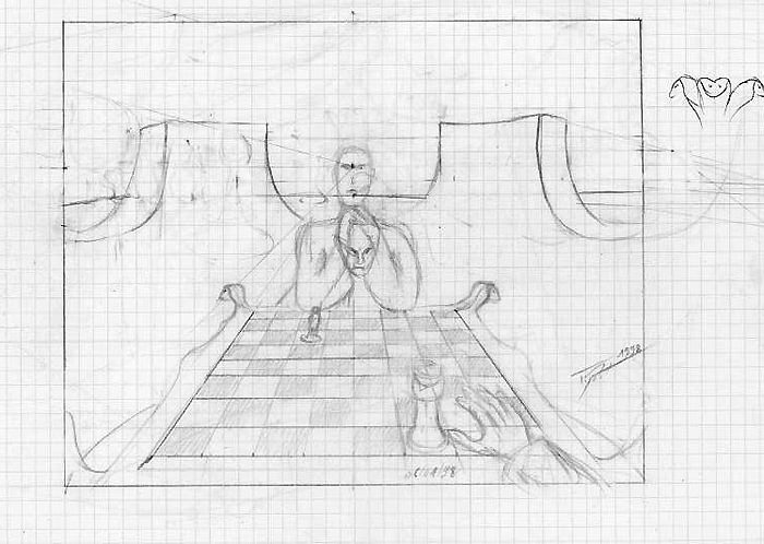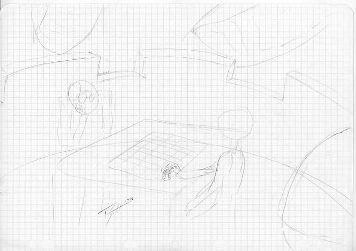Patrick réfléchit longuement avant de se lancer dans un projet de dessin. Il part d'une idée plus ou moins précise, l'approfondit puis crée des ébauches et esquisses préalables qui évoluent ou se précisent au fil de son appréhension, de son cheminement. Chaque dessin est plus ou moins raisonné suivant l'ampleur de sa thématique, c'est particulièrement le cas dans « L'échiquier du destin ». Ce dessin, dira Patrick, est celui qui lui a demandé le plus d'efforts, de réflexions et de temps.