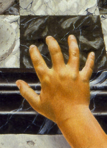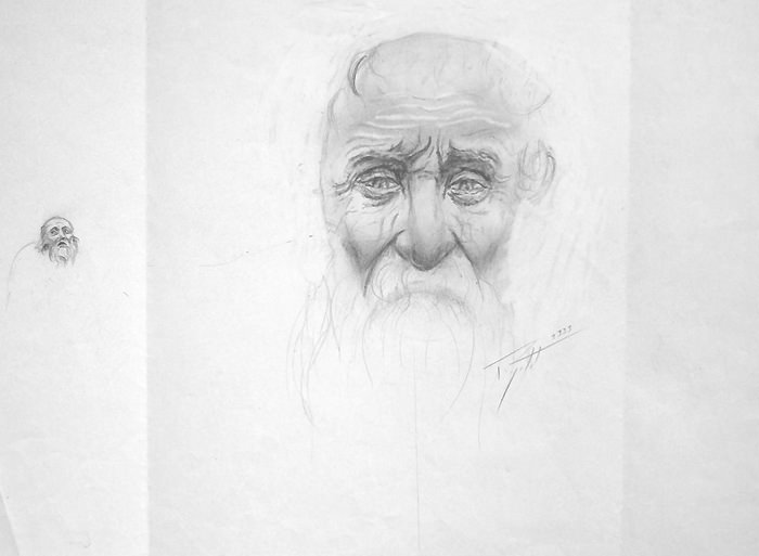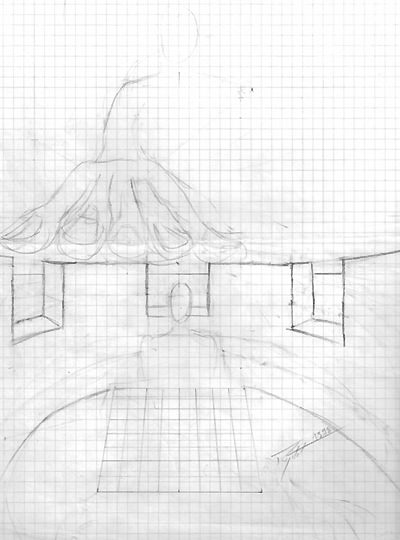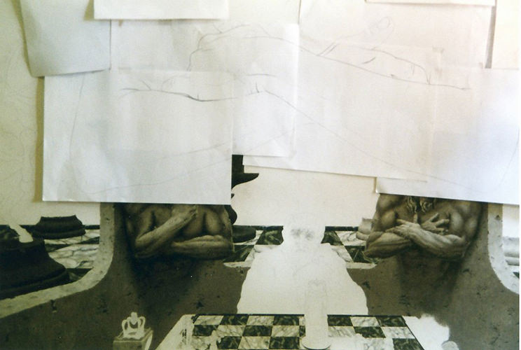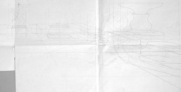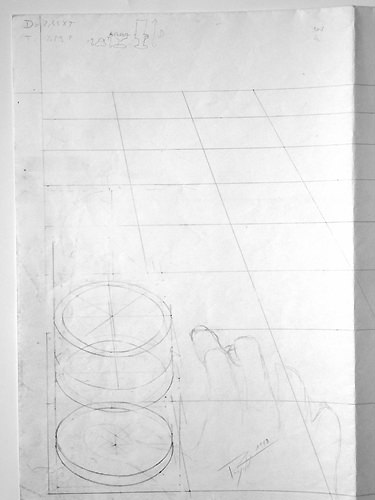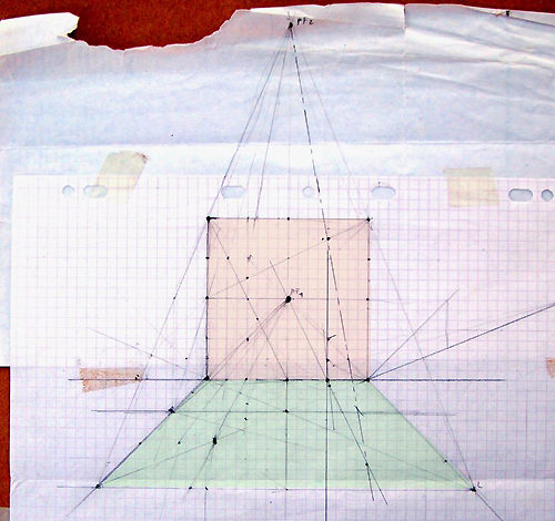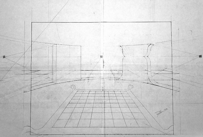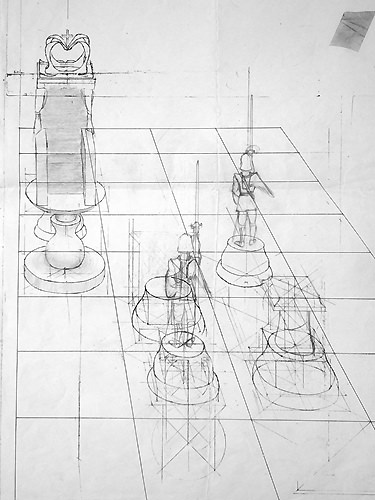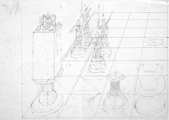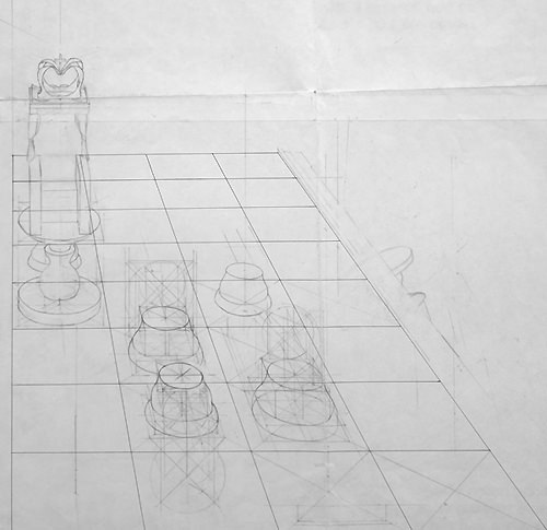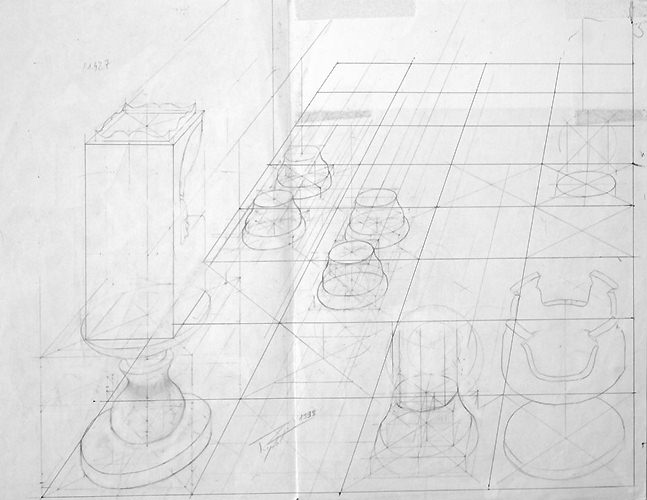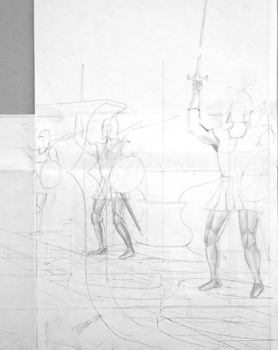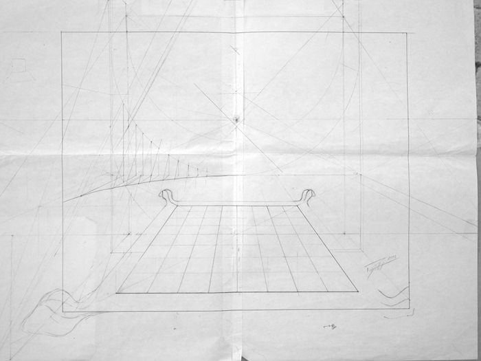 Cette composition a donné lieu à une quantité impressionnante de dessins préparatoires sur lesquels on peut observer l'évolution du projet, et surtout sa mise en application à travers des recherches très poussées en perspective, une approche à la fois très scientifique, philosophique et artistique. Dès le départ, l'idée est là, riche en significations.