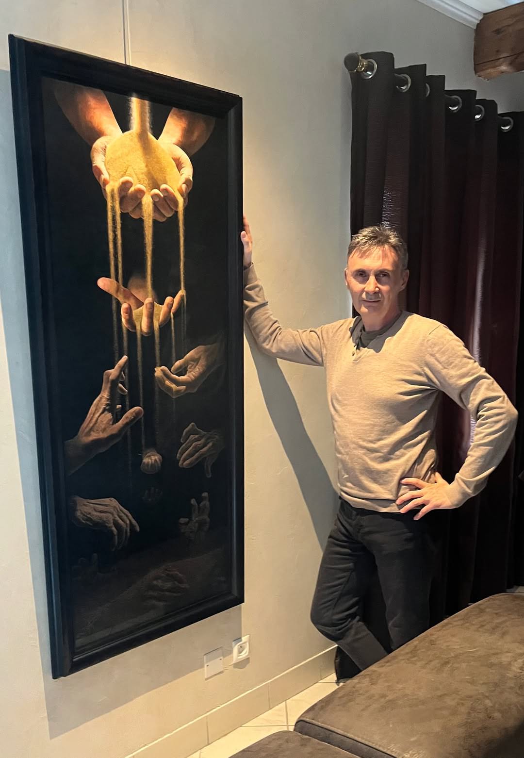 L'égalité, si souvent promise, est une illusion niée par les structures mêmes de nos sociétés. À travers une composition verticale cette allégorie commence avec un filet de sable doré qui s’écoule d’une source unique, capté d’abord par des mains charnues, symboles d’un privilège insolent. Ces mains, placées à hauteur des yeux du spectateur, retiennent l’abondance, ne laissant s’échapper que de minces filets à travers leurs doigts. Plus bas, des mains frêles, torturées, implorantes ou désespérées luttent pour saisir ces miettes, tandis que le sable, perdant son éclat doré, se mue en un gris stérile. Au sol, dans une abondance paradoxale, des mains mourantes émergent, dans une lumière devenue quasi inexistante, comme un cri étouffé de ceux que l’inégalité a réduits à l’état de vestiges. Négalité confronte le spectateur à une réalité inconfortable. Le fond noir, incarnation du néant, et le faisceau lumineux venant du haut accentuent la verticalité hiérarchique, tandis que la gradation du sable – du doré éclatant au gris mortuaire – traduit la déchéance des espoirs. Pour voir les détails tragiques du bas, le spectateur devra se pencher, s’accroupir, s’abaisser : un geste physique qui devient une métaphore de l’effort nécessaire pour reconnaitre les invisibles, ceux que la "négalité" a ensevelis.